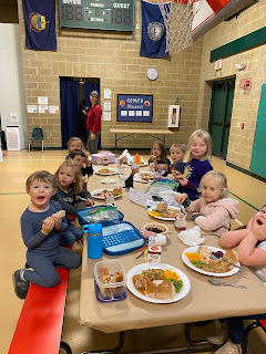 The preschool joined the rest of the school in the gym for a Harvest Lunch to celebrate Veterans. Three veterans, including Edith's dad, joined us for the special lunch.